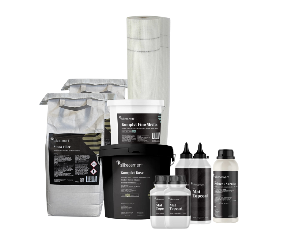 Silkecement Komplet er en serie af spartelmasser der kan bruges på stort set alle overflader, og med den rette opbygning er vandtæt. Silkecement Komplet efterlader en flot og helt unik overflade i stil med Microcement, dog uden at indeholde cement.
