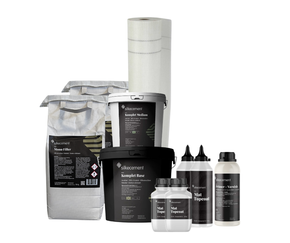 Silkecement Komplet er en serie af spartelmasser der kan bruges på stort set alle overflader, og med den rette opbygning er vandtæt. Silkecement Komplet efterlader en flot og helt unik overflade i stil med Microcement, dog uden at indeholde cement.